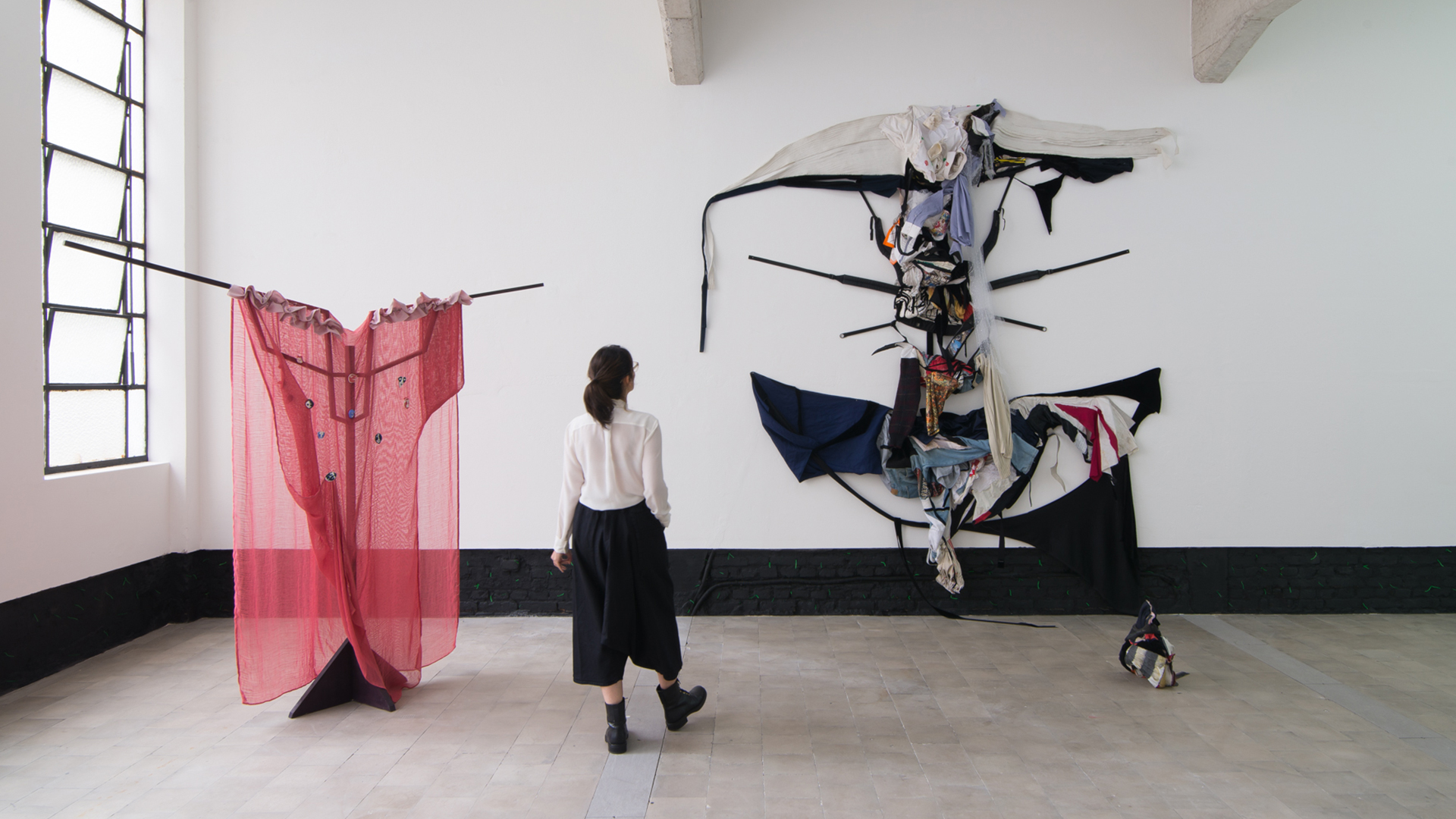 Isso porque exposição de moda, geralmente, têm roupas apresentadas em manequins ou vestidas em suportes feitos para lembrarem o corpo humano. São, no geral, roupas históricas, que foram criadas e usadas por pessoas de verdade em algum momento do passado – ou, então, que terão essa mesma utilidade no futuro. Em “Disfuncional”, como o próprio título já dá o spoiler, quase nada remete a uma roupa usável. “Quando a Jaqueline me convidou para desenvolver um projeto que propusesse essa inter relação moda-arte, propus, de primeira, que usássemos a palavra vestuário, porque moda traz todo um escopo comercial, de tendência e de universo da moda, relacionado ao fashion, ao desfile. Vestuário abarca outras questões: do cotidiano, do político, de uniforme, que é uma coisa mais ampla para ser pesquisada”, conta Marina, que acompanhou a equipe de Elástica em uma visita guiada na galeria.