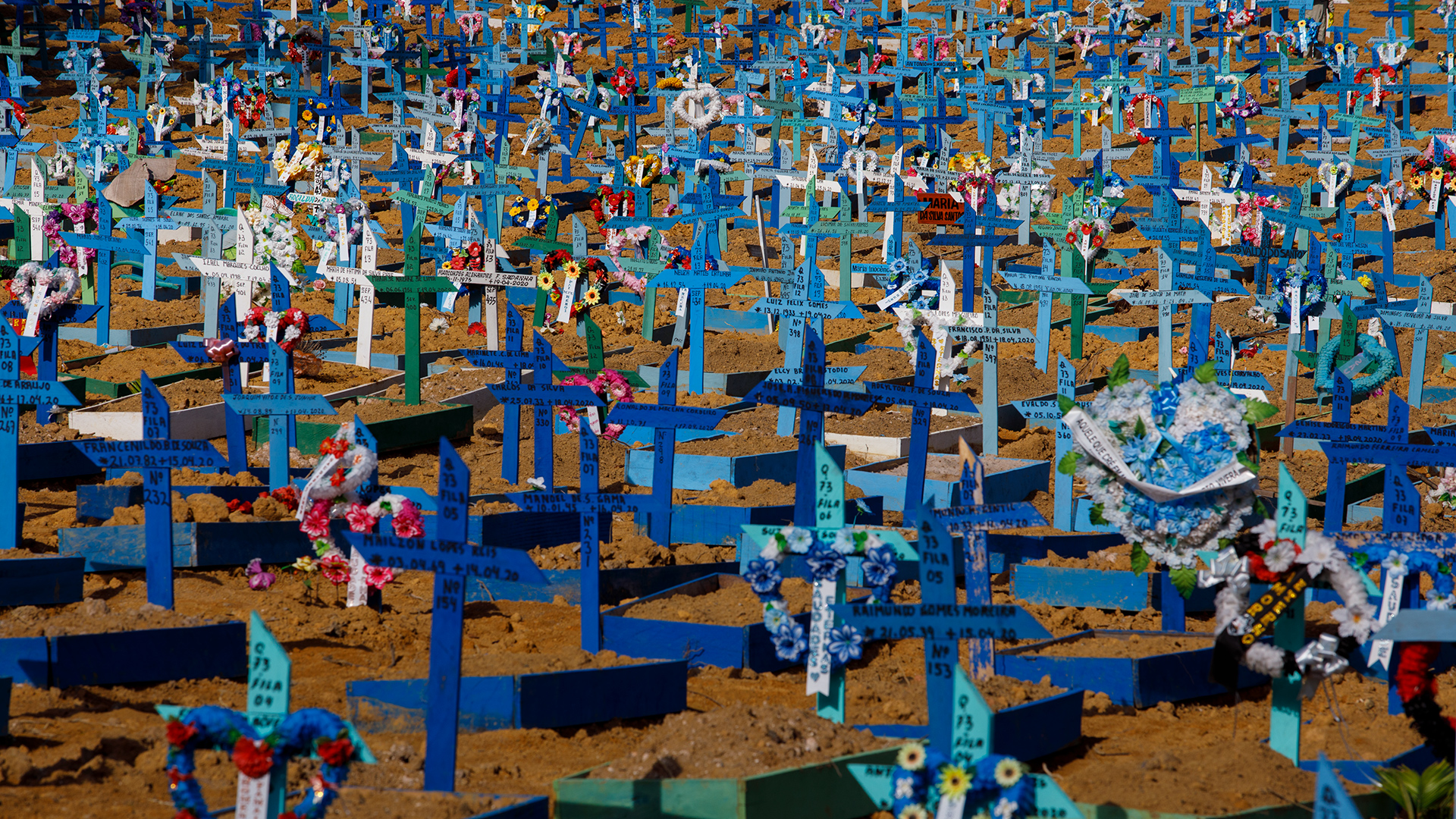 cemitério municipal Nossa Senhora da Aparecida, em Manaus, ganhou fama macabra no início da pandemia, quando a capital do Amazonas se tornou um dos epicentros mundiais das contaminações. Dos Estados Unidos até a Austrália, jornais e revistas de vários países estamparam as enormes valas abertas às pressas para receber centenas de vítimas da covid-19. Além dos coveiros fazendo hora extra paramentados com roupas de plástico cavando buracos em um calor infernal, outra imagem local ficou gravada na memória: o mar de cruzes azuis.